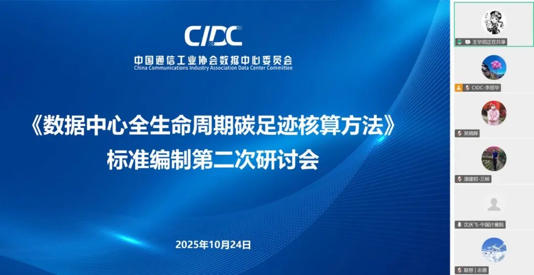 2025年10月24日,由中国通信工业协会数据中心委员会(CIDC)组织、中国长江电力股份有限公司与华中科技大学牵头主编的《数据中心全生命周期碳足迹核算方法》标准编制第二次研讨会顺利召开。20余家参编单位专家代表及行业权威专家齐聚,围绕标准内容展开深度研讨,会议由CIDC副秘书长刘莹主持。